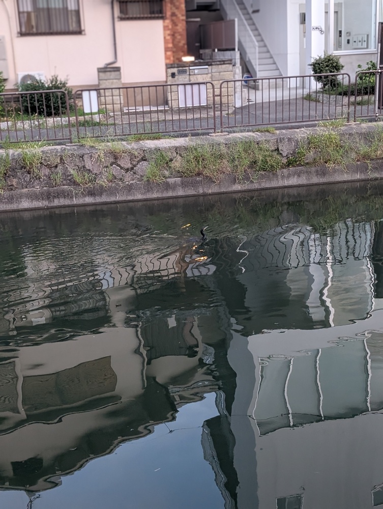 彼岸花の赤と、薄の穂の銀色。その間を行く黒い影が、川面に長くのびます。寒露のころのカワウは、潜っては羽を乾かし、ゆっくりと季節の歩みを知らせてくれます。
