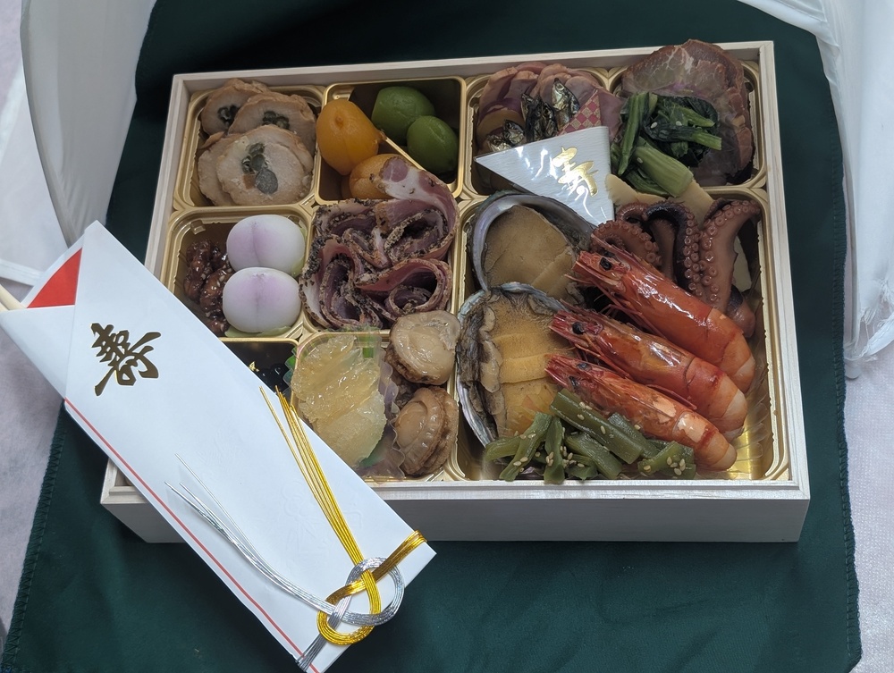 - 装い:木箱入り・風呂敷包み・お品書き・祝箸(三膳)