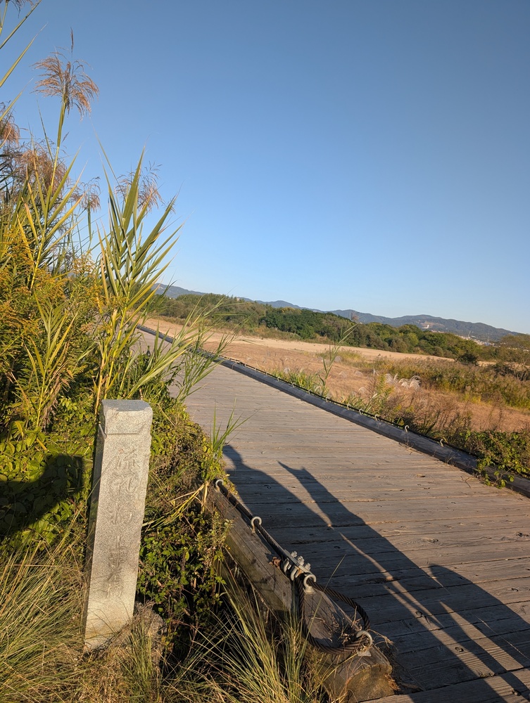 立冬を過ぎた頃の流れ橋は、朝の川霧がふんわり漂い、 差し込む陽の光に橋板がほの白くきらめきます。 ススキが揺れて、遠くから野鳥の声がして―― ほんに、映画のワンシーンみたいな景色どす。