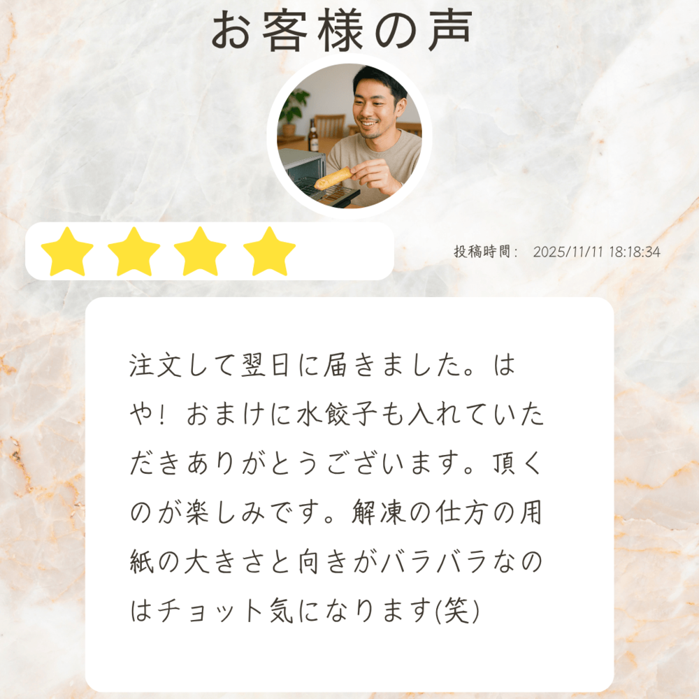 お届けの速さや、水餃子を喜んでいただけたとのこと、うれしゅう存じます!