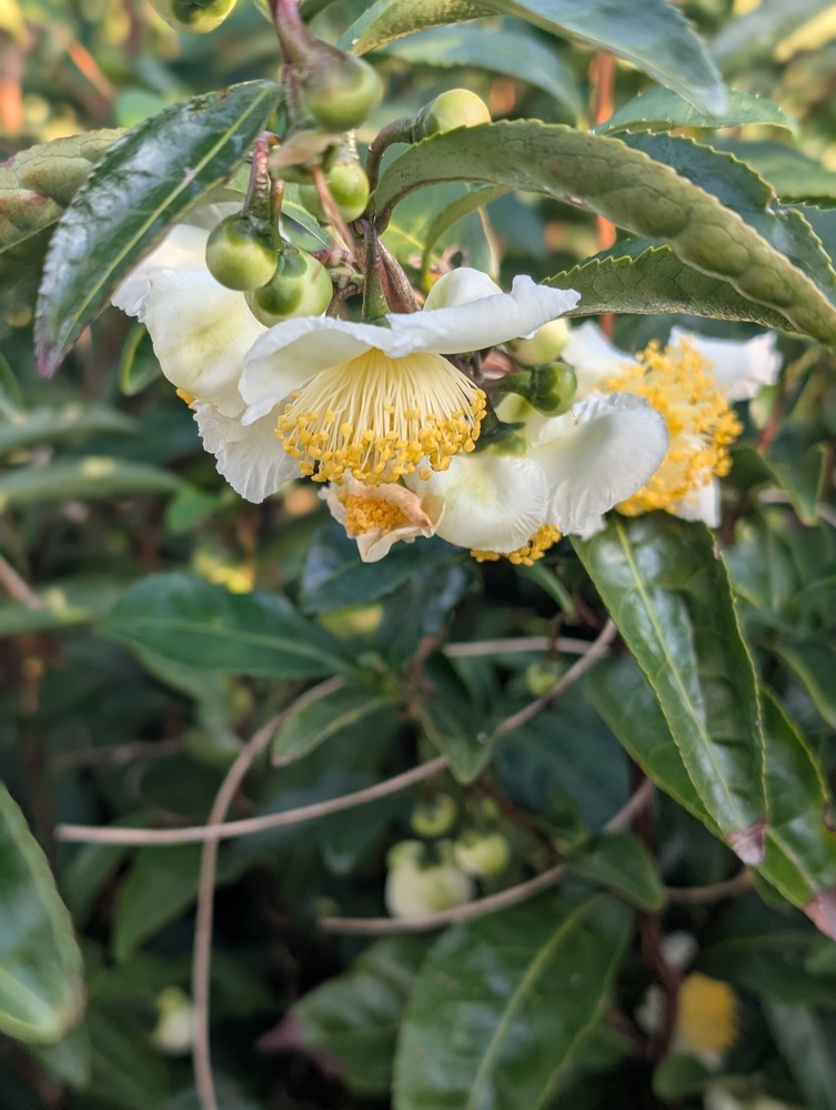 茶の木は椿の仲間どすので、花の形もどこか似ております。 白い花びらに、まるい黄金の雄しべが揺れ、 咲くのは十月から十二月にかけて。 霜が降りる季節、静かに冬を知らせてくれます。