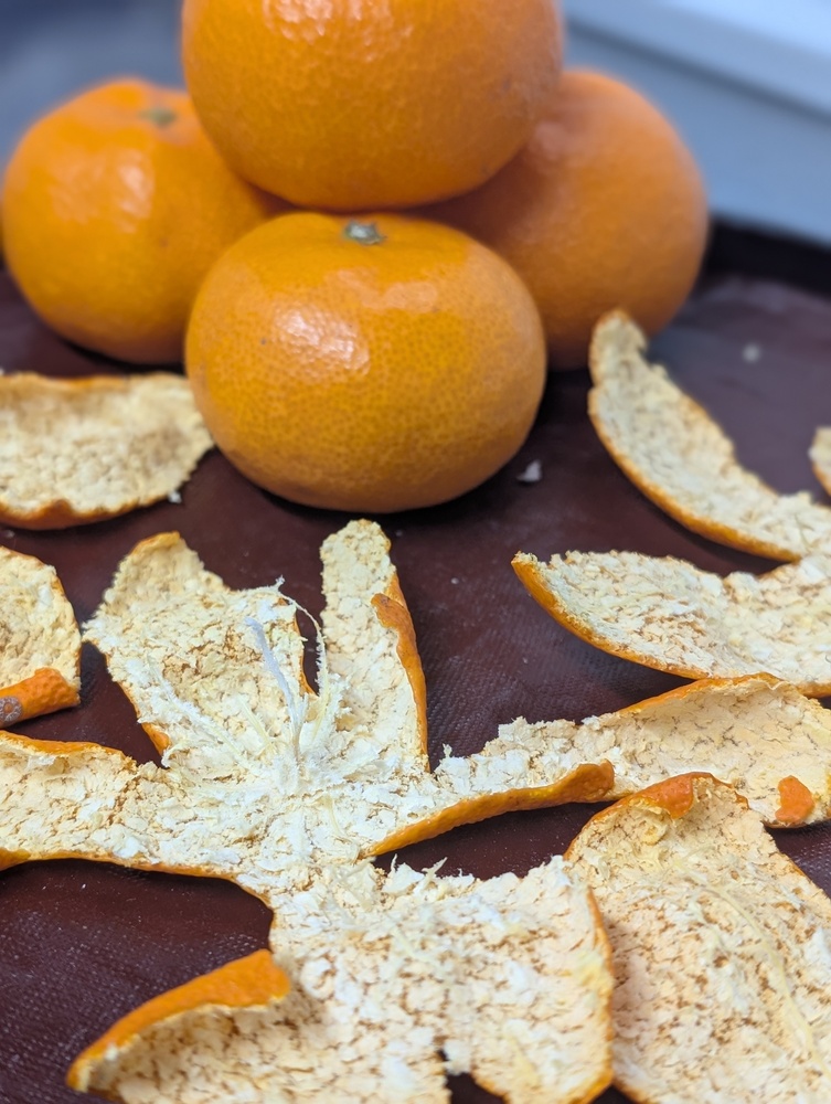 ヘタを下にして、頭から三等分に縦の切り込みを入れまする。ヘタの部分だけ繋げたまま、花が開くようにペリペリと剥く。大きく剥くことで、香りの成分である油胞を壊さず保存できるのでござる。