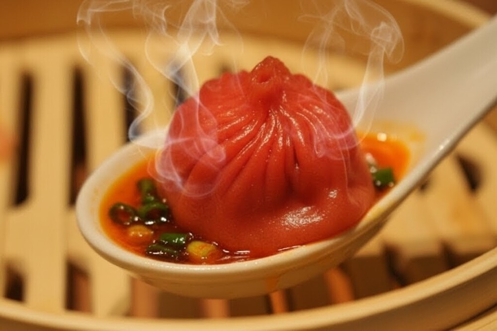 有吉さんがそう言って手に取ったのは、蒸籠(せいろ)の中で一際目を引く、鮮やかな赤色をした麻辣小籠包。まさに、刺激を求める大人にぴったりの一品でござる。